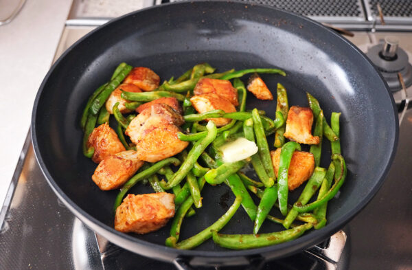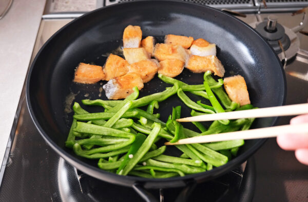 鮭をひっくり返して端に寄せ、ピーマンを加えて炒める。