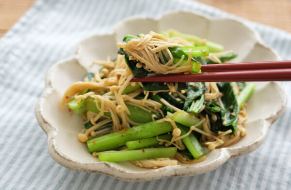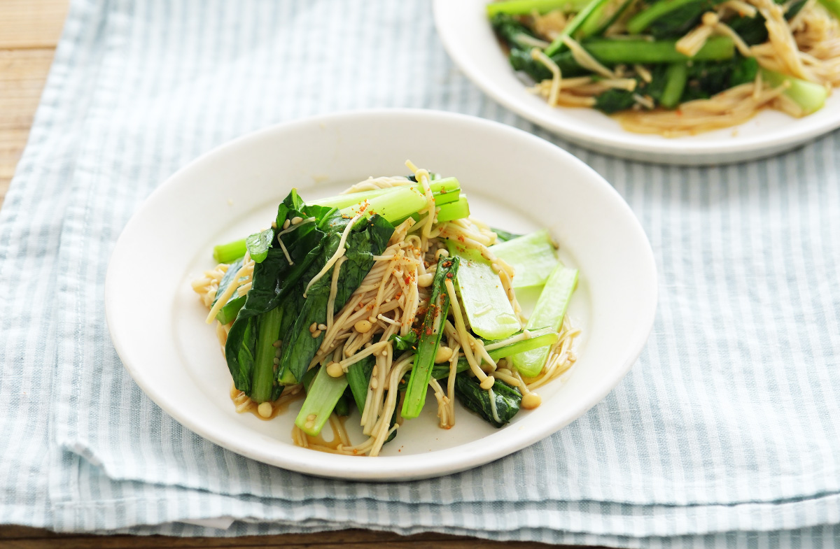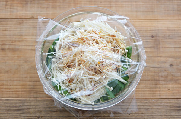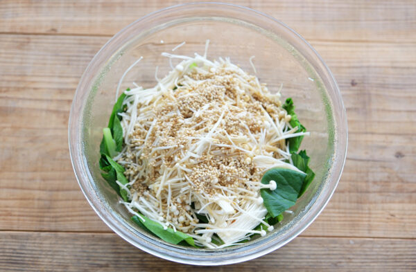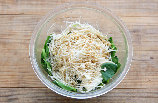 耐熱容器に小松菜とえのきを入れて、献立いろいろつゆ、水、ごま油を回しかけ、ふんわりとラップをかける。
