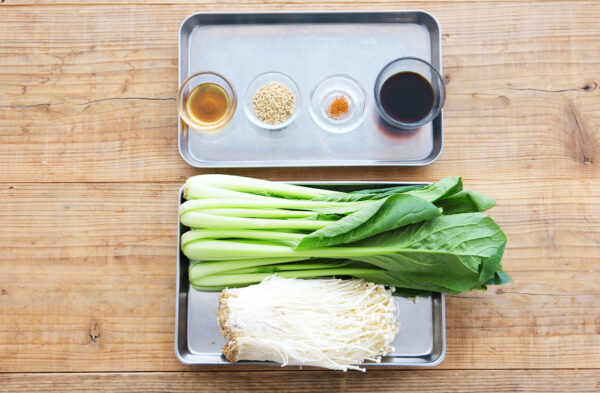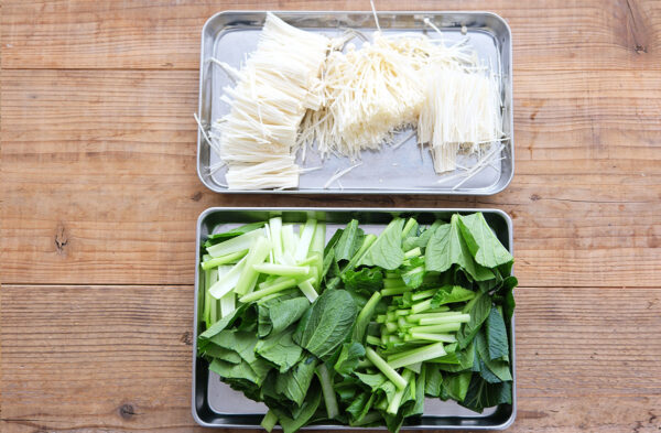 小松菜は4cm幅に切る。えのきは石づきを取って半分に切る。