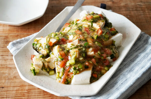 器に盛りつけ、お好みで七味唐辛子をトッピングする。