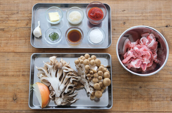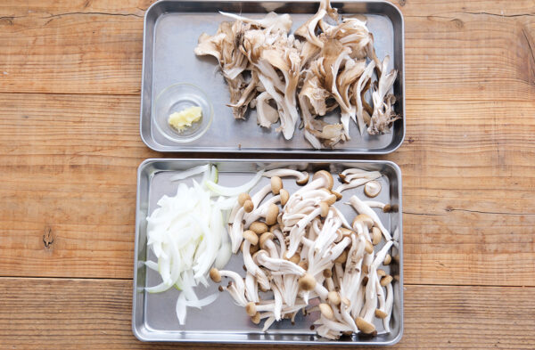 しめじは石づきを取ってバラバラにする。舞茸は食べやすい大きさにさく。玉ねぎは薄切りにする。にんにくはすりおろす。