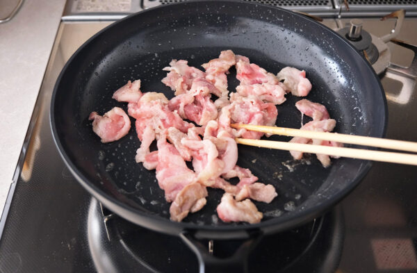 フライパンに油を熱し、豚肉を入れて白っぽくなるまで炒める。