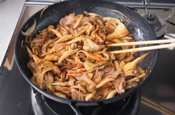 しめじ、舞茸、玉ねぎを加えて3分炒める。