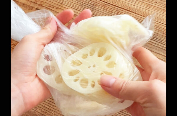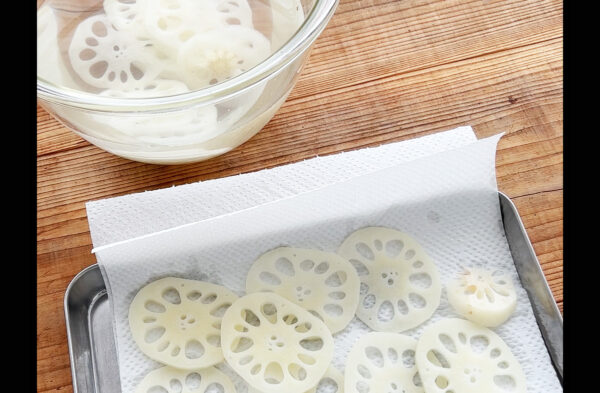 れんこんは皮をむいて薄切りにする。酢水(水500mlに酢大さじ1)にさらして、キッチンペーパーで水気を拭き取る。