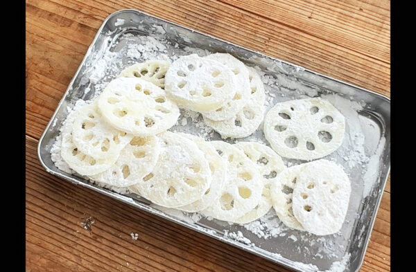 バットや皿に片栗粉を広げ、袋から取り出したれんこんにしっかりとまぶす。