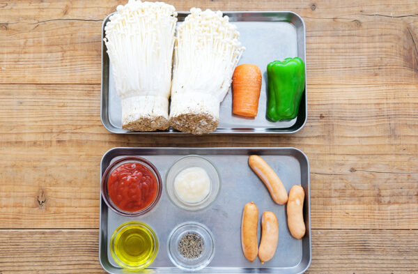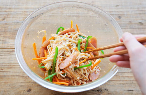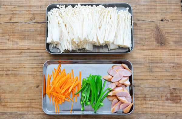 えのきは石づきを取ってばらす。ピーマンは幅5mm幅の細切りにする。にんじんは千切りにする。ウインナーは斜め薄切りにする。