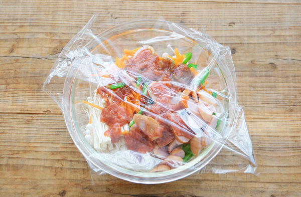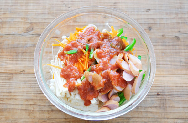 (2)にふんわりとラップをかけ、電子レンジ(600W)で5分加熱する。