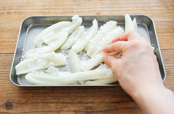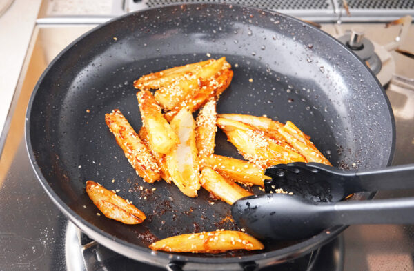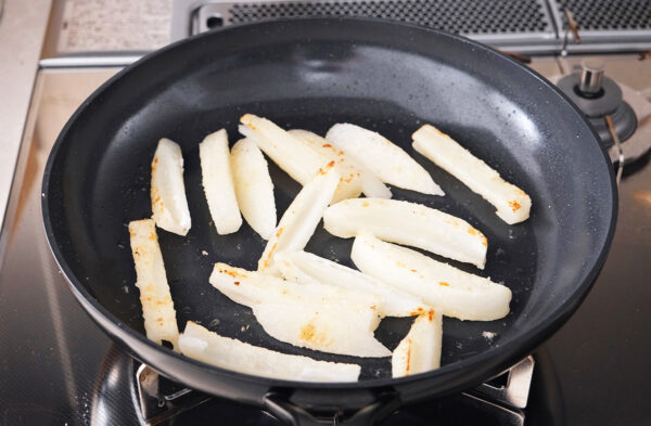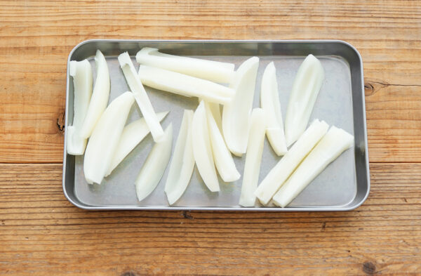 縦切りにすることで、れんこんの食感が引き立ちます。