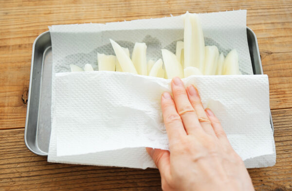 (1)を水に5分さらした後、キッチンペーパーでしっかりと水気を拭き取る。