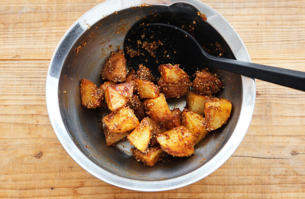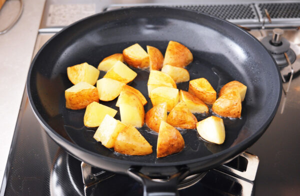 じゃがいもを炒める前に電子レンジで加熱しておくことで、調理時間を短縮できます。