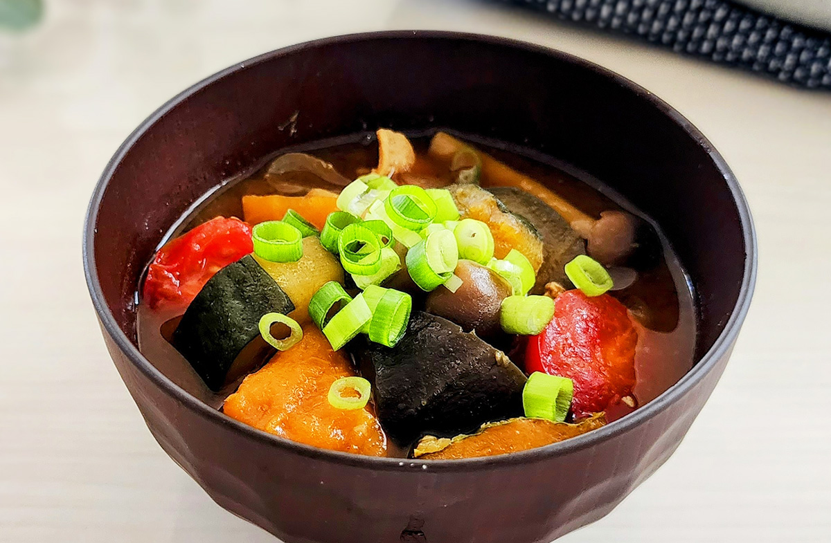 抗酸化ビタミン&カリウムたっぷりの夏野菜、糖代謝を高める&疲労回復ビタミンたっぷりの豚肉、抗酸化作用&コレステロールを下げるといわれるメラノイジンが豊富な豆味噌。全部入れて作る赤だしは、旨みも栄養もたっぷりです。