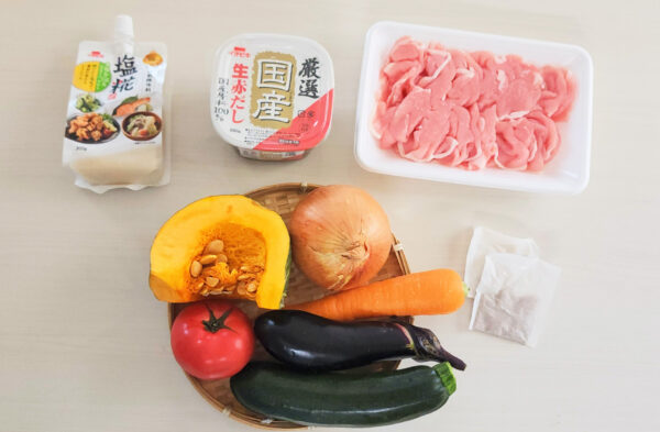 鍋に具材を、しめじ→ズッキーニ→なす→かぼちゃ→にんじん→玉ねぎ→豚肉→だし→みそ の順で重ねて入れる。