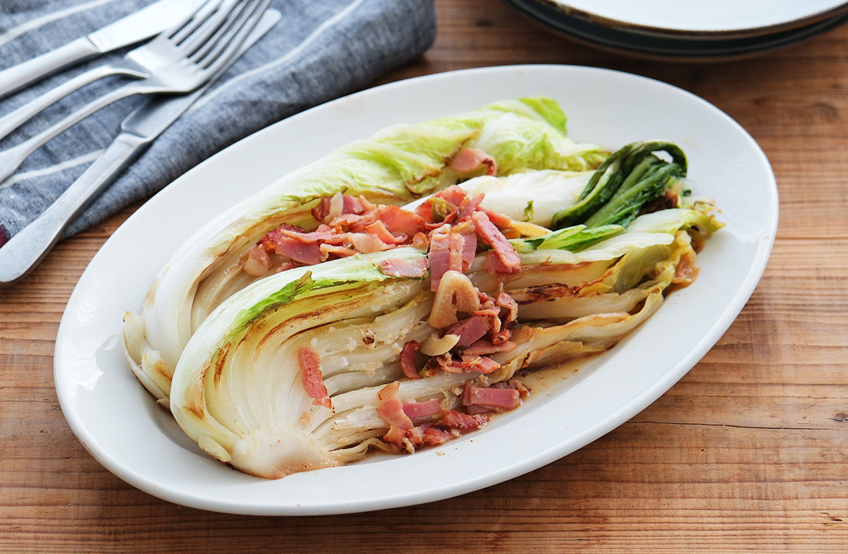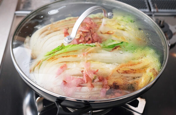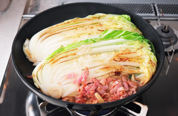 白菜をひっくり返し、ベーコンとにんにくを加えて香ばしい香りが出るまで3分焼く。