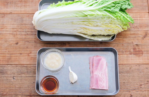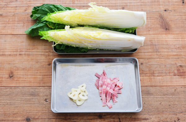 白菜は縦半分に切る。ベーコンは1cm幅の短冊切りにする。にんにくは芯を取り、薄切りにする。