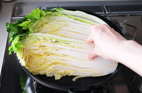 白菜は手でフライパンに押し付けるようにのせ、焼き色をつけてください。香ばしさも美味しさのポイントになります! にんにくの芯は焦げやすいので取りましょう。