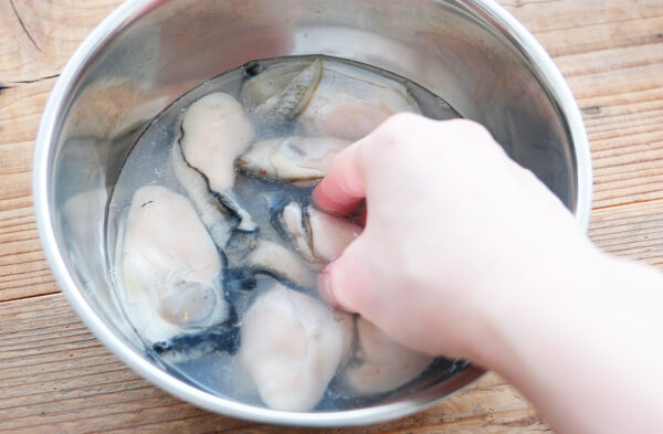 牡蠣のひだの部分を中心に、汚れが取れるまで10回ほど水を入れ替えて洗う。