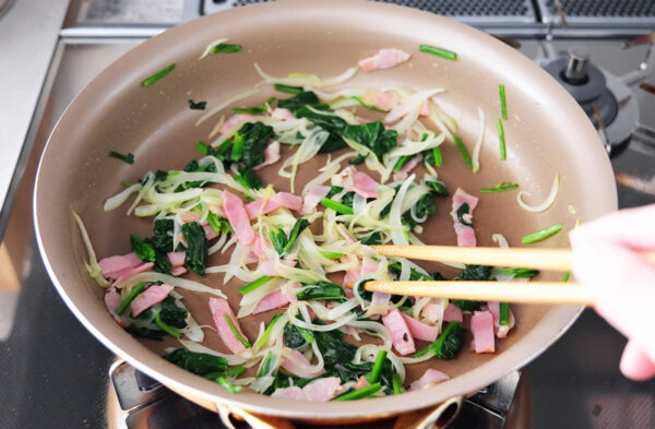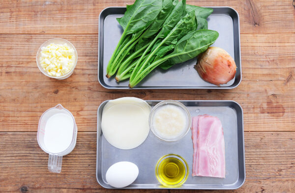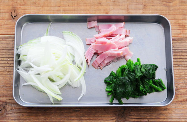 (1)のほうれん草は2cm幅に切る。玉ねぎは薄切りにし、ベーコンは1cm幅の短冊切りにする。