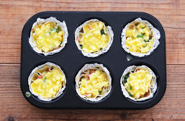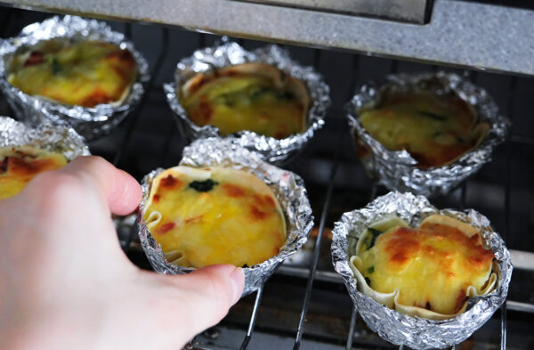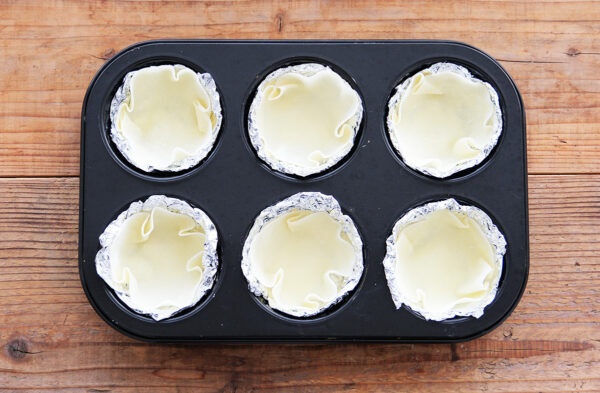 アルミカップに餃子の皮を入れて形を整える。(写真では、マフィンの型にアルミホイルを敷いています。)