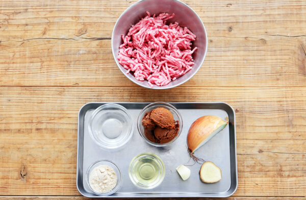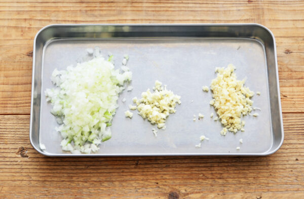 玉ねぎ、しょうが、にんにくをみじん切りにする。