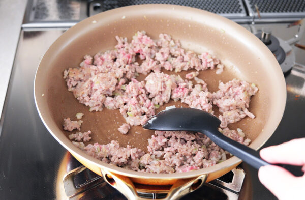 フライパンに油を熱し、(2)を入れて香りを出す。豚挽き肉を加え、色が変わるまで炒める。