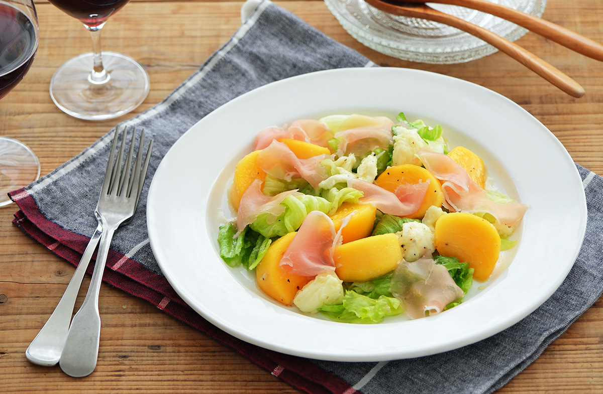 切って混ぜるだけの簡単おもてなしレシピ。柿の甘みと生ハムの塩気は、ワインとの相性も抜群です。塩糀を使ったドレッシングで、より奥深い味わいに仕上がります。