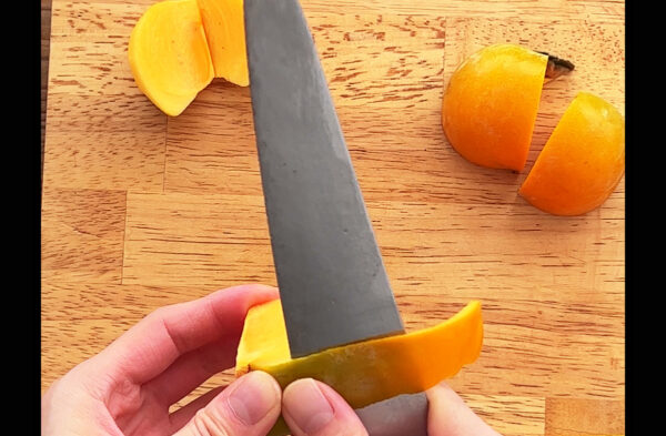 柿は皮付きのまま4等分に切り、皮を剥いてさらに半分に切る。種があれば取り除く。