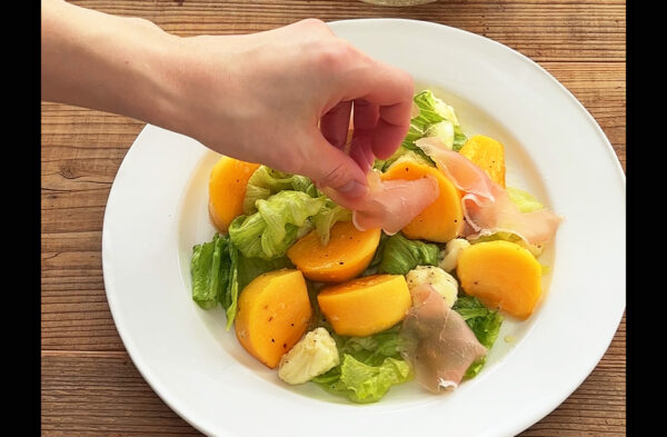皿に盛りつけ、生ハムをちぎってトッピングする。