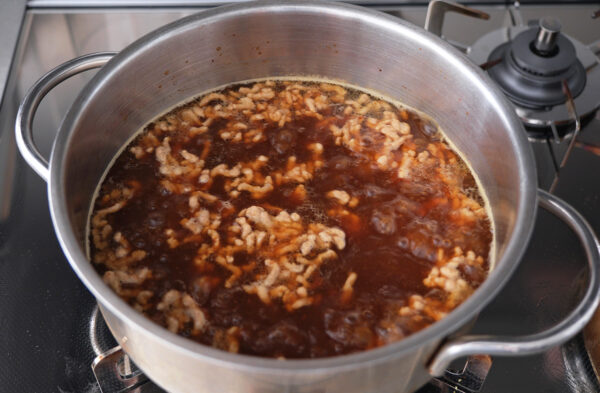 鍋に献立いろいろつゆと水を入れて熱し、煮立ったら豚挽き肉を入れ、火が通ったらアクを取る。