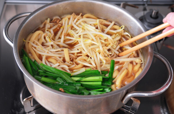 ニラ、もやしを入れる。フタをして1分煮て、サッと混ぜ合わせる。