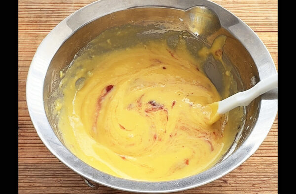いちごジャムを加え、ゴムベラでさっくり混ぜる。