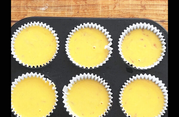 マフィン型に耐熱の紙カップを敷き、生地を流し入れる。