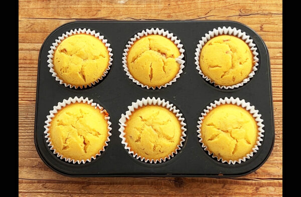 160℃のオーブンで25分(竹串をさして生地がつかなくなるまで)加熱する。