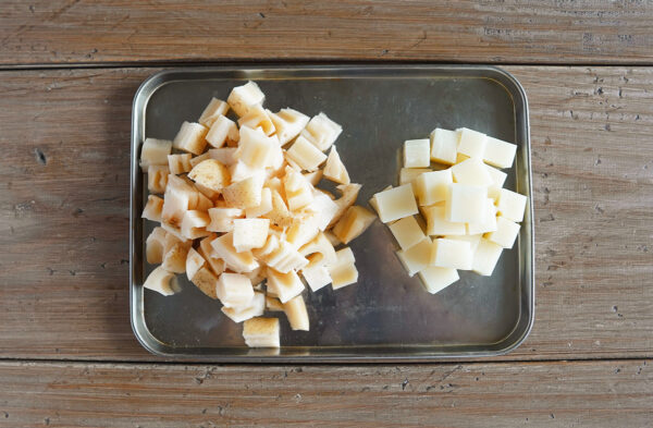 れんこん(皮ごと)と切り餅は1.5cm角に切る。