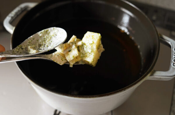 炭酸水、薄力粉(大さじ3)、塩糀、青のりを加えて和える。