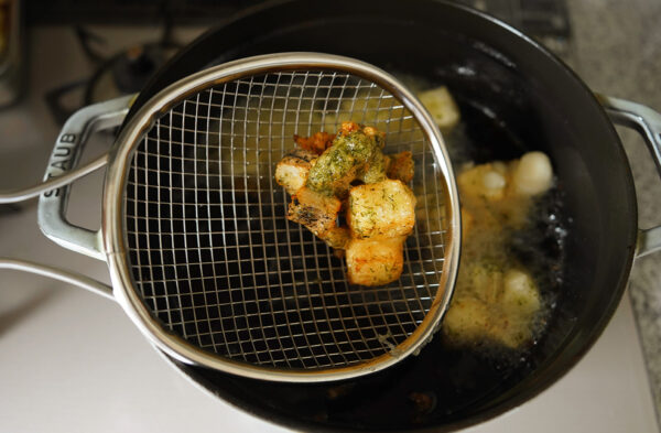 鍋に深さ3cm程度の油を入れて180℃に熱する。(3)をスプーンですくって落とし入れる。