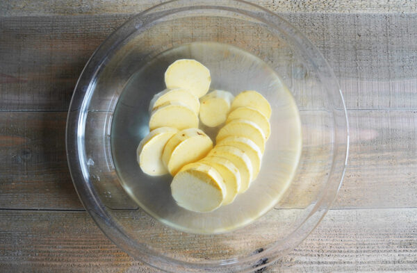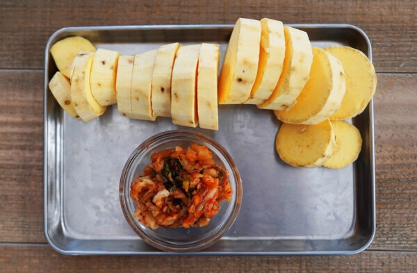 さつまいもは皮をむいて輪切りにする。キムチはみじん切りにする。