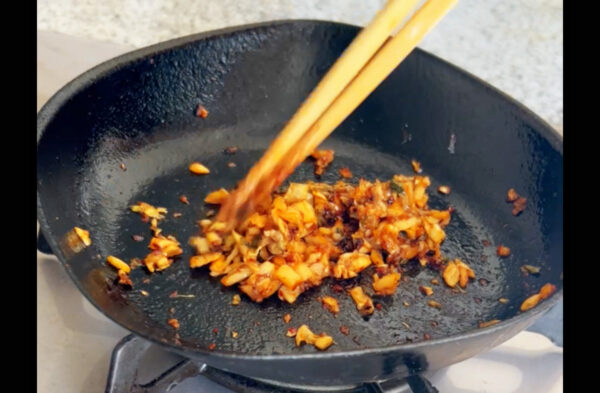 キムチを炒めることで酸味が飛び、香ばしい香りになります。