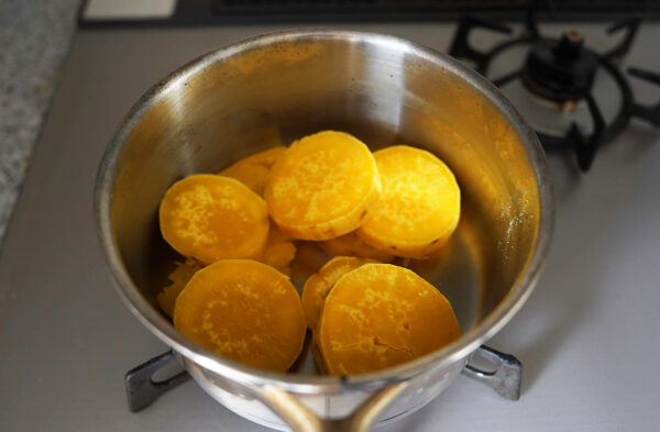 小鍋にさつまいもを入れ、さつまいもが浸る量の水(分量外)を加える。竹串がすっと通るほど柔らかくなるまで煮て、水気をきる。