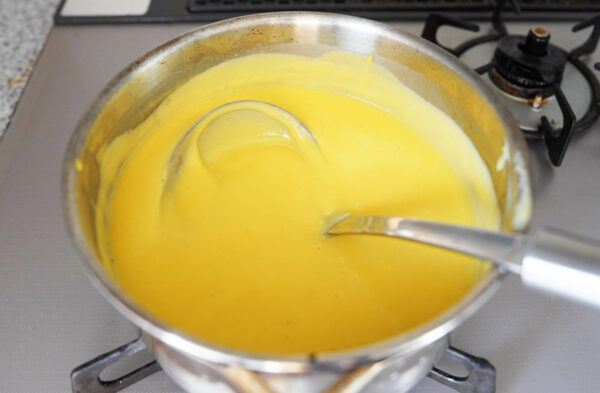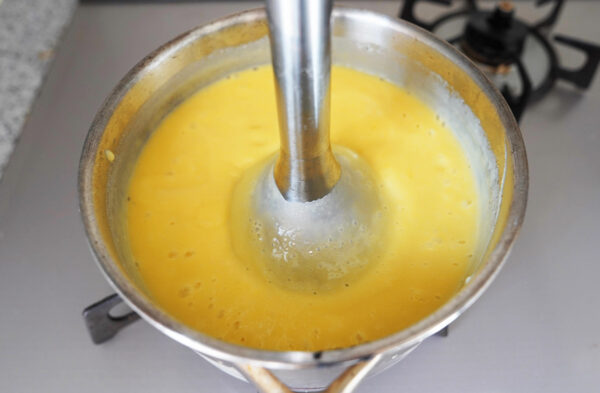 小鍋に塩糀、豆乳を加えてハンドミキサーで撹拌する。