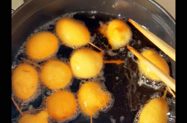 鍋に4cm程度の油を入れて180℃に熱し、全体にきれいな焼き色がつくまで揚げる。