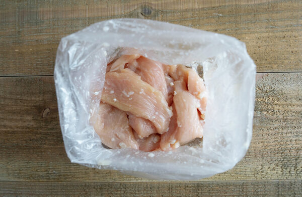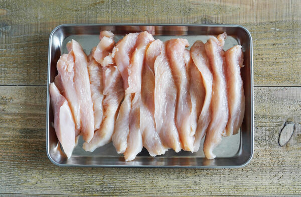 鶏肉の皮と血合いは取り除き、斜め薄切りにする。
