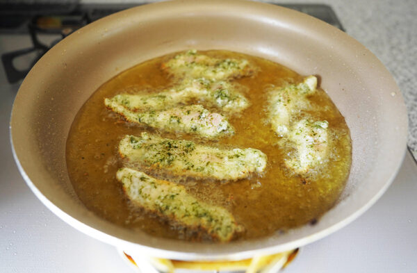 フライパンに深さ1cm程度の油を入れて熱し、中火で揚げ焼きにする。衣がカリっとしたら裏返す。