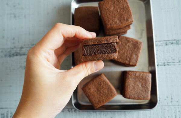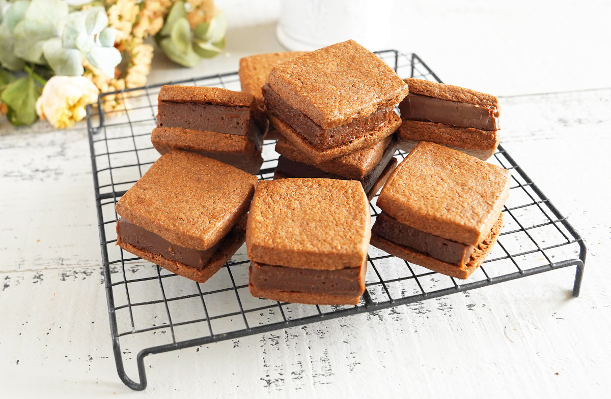 ほろっと口どけの良いココアクッキーで、濃厚な生チョコレートをサンドした贅沢な一品。