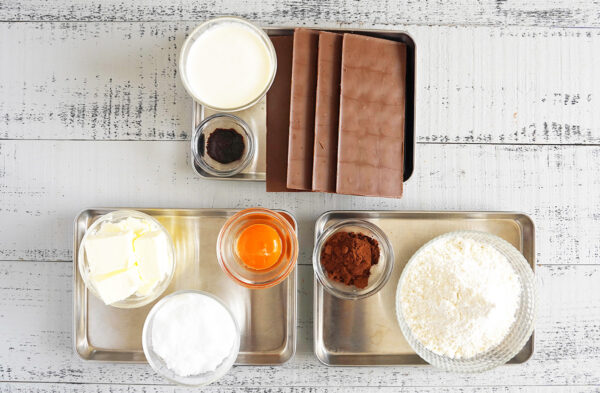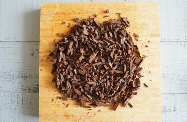 バターは常温に戻す。オーブンを180℃に予熱する。板チョコレートを細かく刻む。
