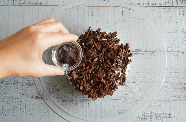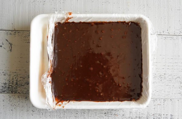 (2)をラップを敷いたバットに流し込み、冷蔵庫で2時間冷やす。(型に16cm×8cmの仕切りを付けると厚みのある生チョコが作れます。)