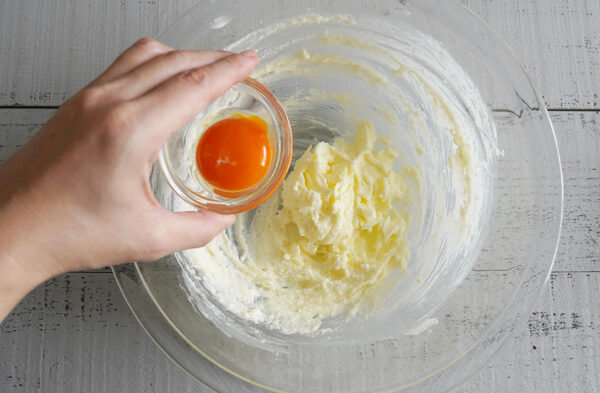 バターを泡立て器で混ぜる。砂糖、卵黄を加えて混ぜ合わせる。