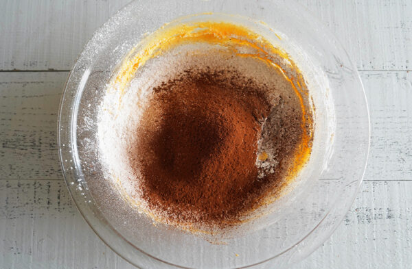 (4)に薄力粉、ココアパウダーを振るい入れ、ゴムベラでさっくり混ぜる。