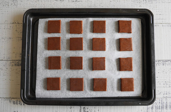 (6)を厚さ7mmに伸ばし、4cm角で16枚に切る。180°Cに予熱したオーブンで15分焼く。粗熱を取る。