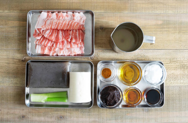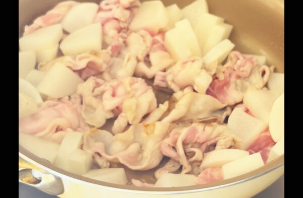 フライパンにごま油を熱し、豚肉、大根、こんにゃくを豚肉の色が変わるまで中火で炒める。