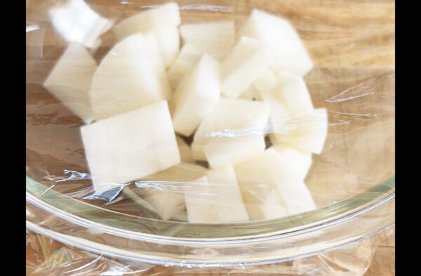 大根は1cm幅のいちょう切りにする。耐熱容器に入れてふんわりとラップをかけ、電子レンジ(600W)で4分加熱する。